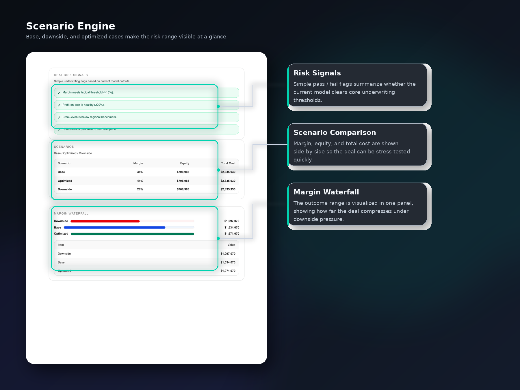 SiteKillSwitch compares downside, base, and optimized scenarios to show how the development economics change as assumptions shift. This helps identify whether the project has enough buffer to withstand lower sales prices, cost increases, or timeline delays.