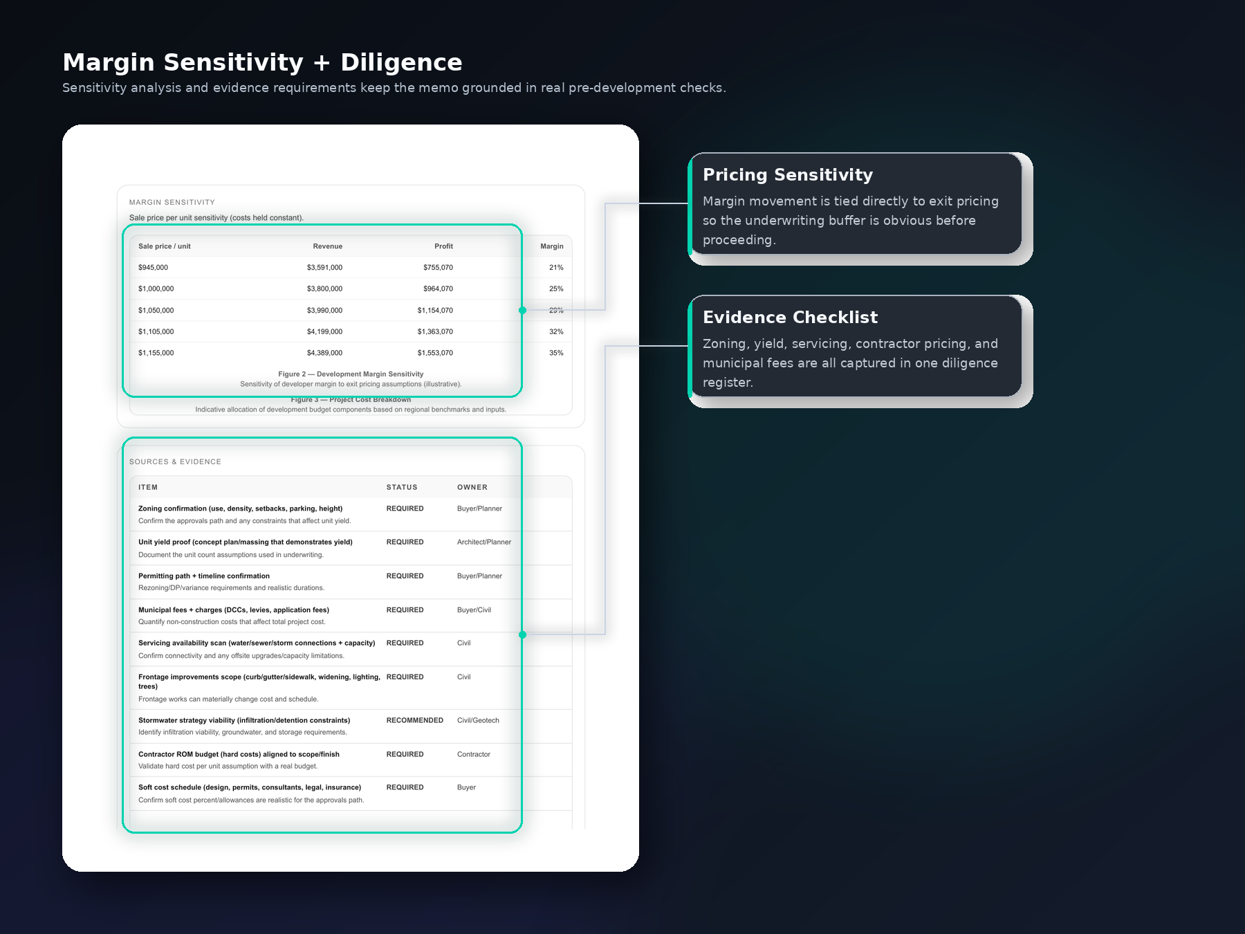 These typically include zoning confirmation, achievable unit yield, servicing requirements, contractor budget validation, comparable sales evidence, and financing assumptions.