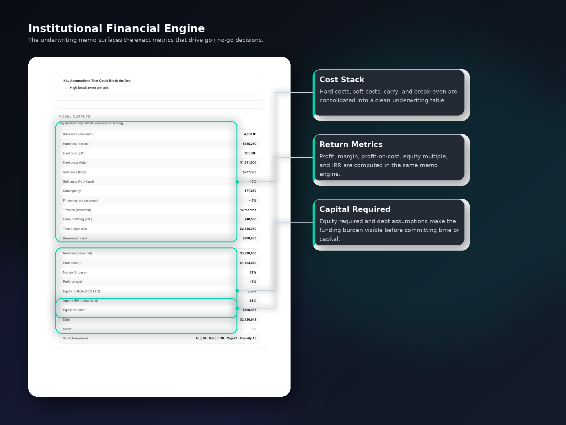 Instead of spending weeks analyzing opportunities that ultimately fail basic economics, the platform allows you to test assumptions quickly and produce a structured underwriting memo within minutes.